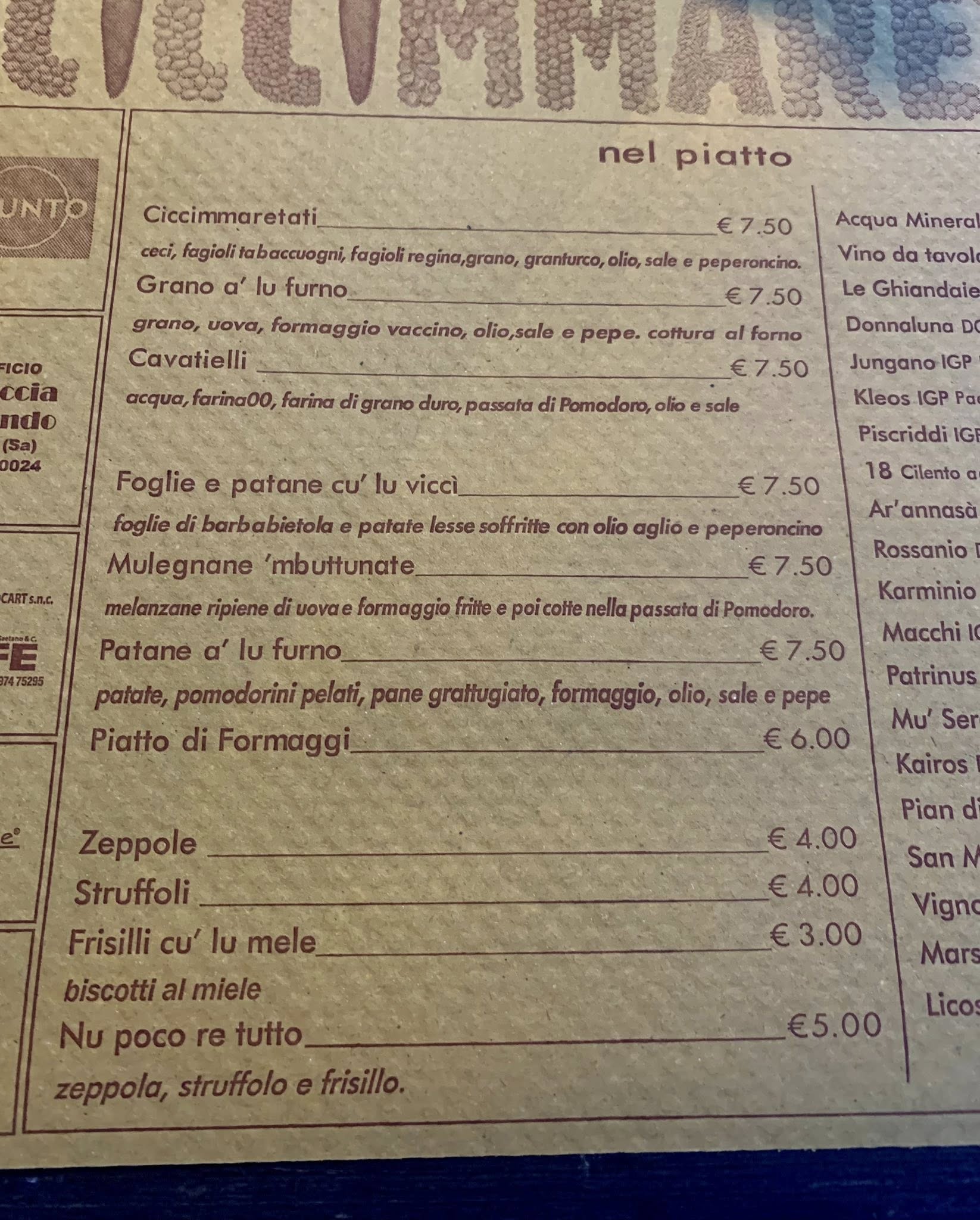 Completa il menu un piccolo assortimento di formaggi, con caciocavallo e cacioricotta di capra fresco. Nel corso del tempo, poi, si è affinata anche la proposta nel bicchiere, con una lista di vini cilentani: tutti produttori locali, compresa una piccola azienda di Stio.
