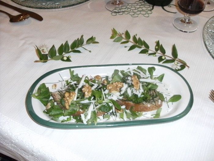 S’incomincia con sfiziosi assaggini di frittelle impanate e fritte di cicoria selvatica, di salvia e di fiori, seguiti subito da fiori di zucca con la mozzarella. Poi, senza interruzione, ecco serviti dei crostini di pane di castagne, con crema di melanzane, crema all’ortolana e crema di mandarino. Rotolo ripieno di melanzane, cicoria e prosciutto. Bruschette alle erbe mediterranee, noci e cacioricotta di capra.