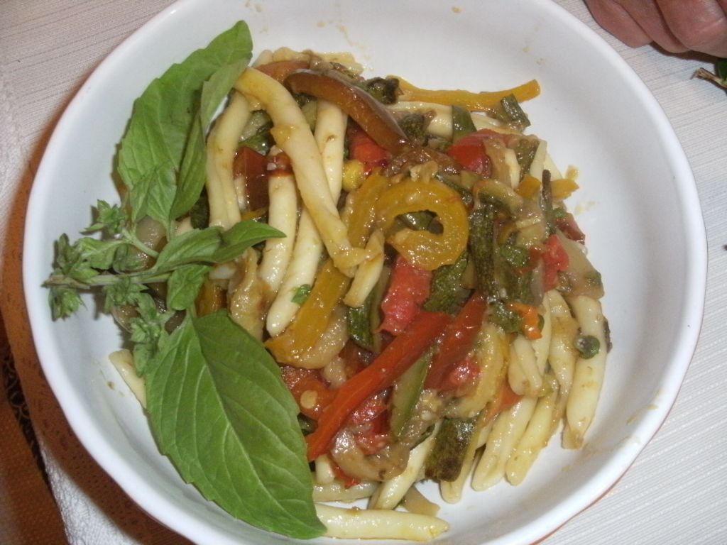 Altro antipasto variegato: cacioricotta di capra, formaggio ovino e caprino, pera alla cannella, fichi all’Aglianico, marmellata di asparagi selvatici e vincotto, che bontà! Pietanze semplici e genuine che si rifanno ad una vecchia tradizione locale. Ecco avanzare poi due saporitissimi primi, che ricordano le giornate di festa nel Cilento, quando i contadini, dopo una lunga settimana di duro lavoro, posavano i loro attrezzi per sedersi felicemente alla tavola imbandita e sempre affollata: cavatielli con crema di ceci, mozzarella, noci e rucola e poi fusilli all’ortolana con tante verdure fresche appena raccolte nell’orto dietro casa. Per secondo un delizioso e profumato agnello al mirto cotto a puntino.