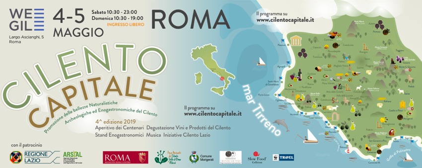 Anche quest’anno il Cilento e il suo capitale arrivano a Roma. Cilento Capitale nasce grazie all’intuizione di Antonio d’Agosto per valorizzare il Cilento e le sue risorse enogastronomiche, naturalistiche e artistiche. Si terrà Il 4 e 5 maggio negli spazi di WEGIL , uno splendido edificio degli anni trenta che la Regione ha trasformato in un grande Hub culturale. Numerosi i patrocini, tra i quali la Regione Lazio, il I° Municipio, il Parco Nazionale del Cilento, Slow Food Cilento, WWF Travel e il Comune di Morigerati.