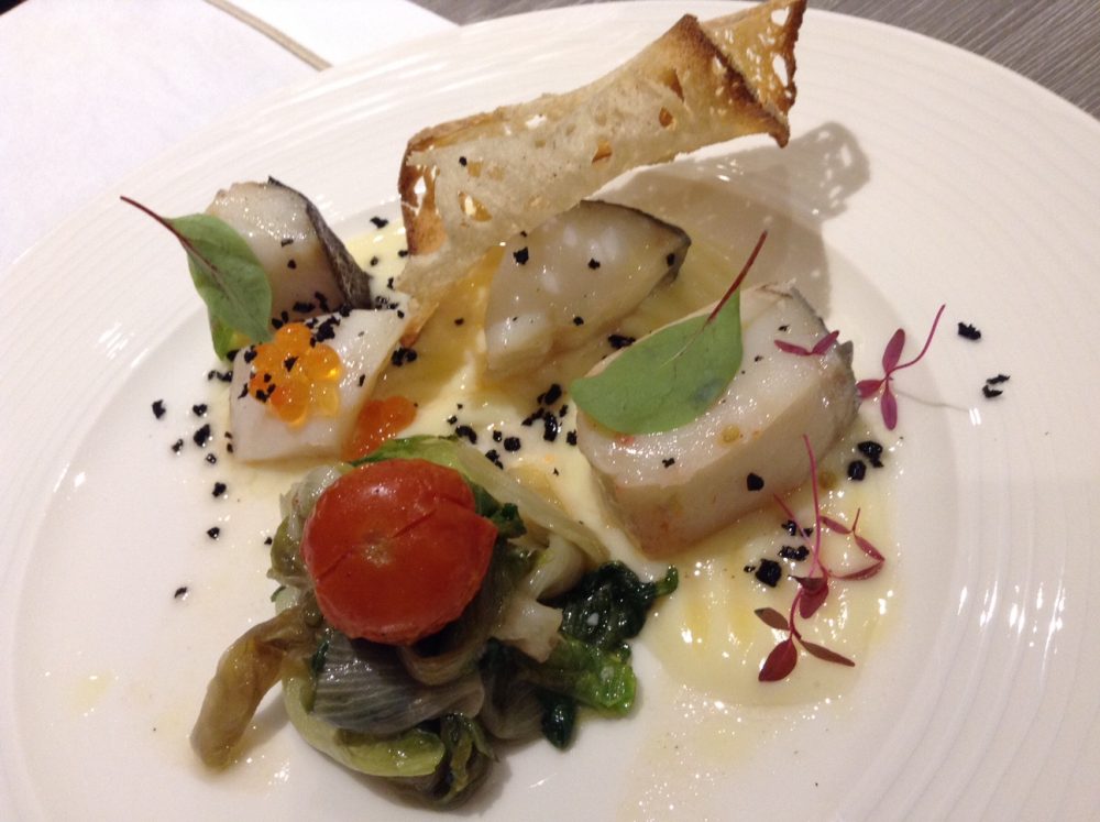 Baccalà cotto a bassa temperatura su crema di patate, cenere di olive nere Pisciottane e pomodoro confit