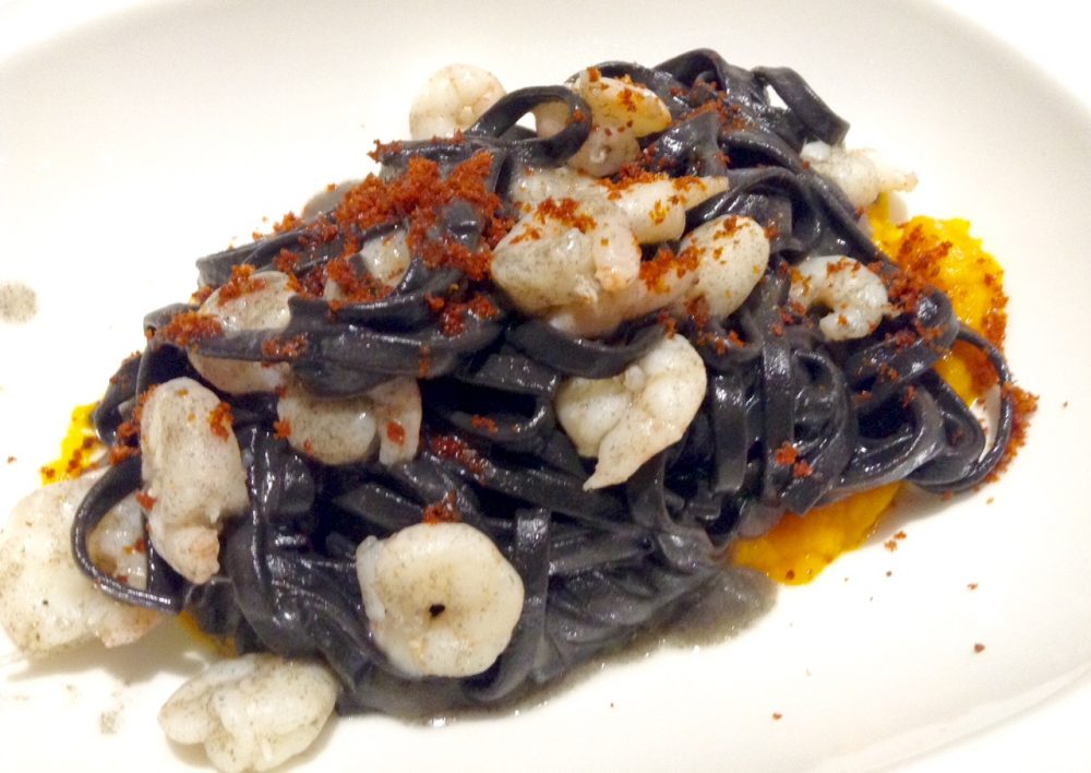 Tagliolini al nero di seppia, gamberi bianchi di Acciaroli, crema di zucca, sento con piacere pepe non dichiarato, piatto sopra media