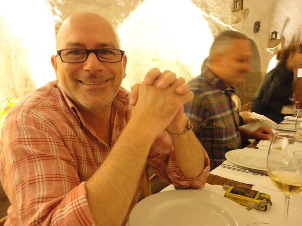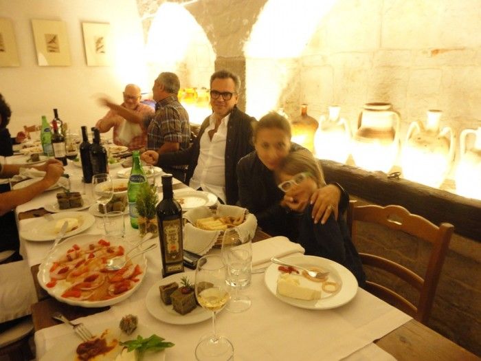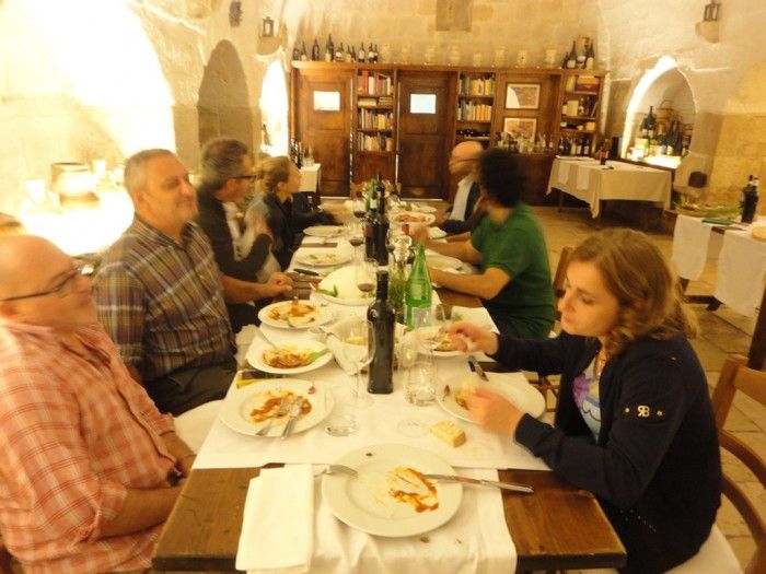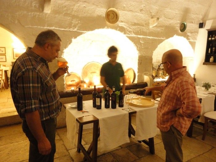 E trova pure il tempo, il nostro simpaticissimo anfitrione Bàrbera, per farci visitare la struttura. Meravigliosa nella sua architettura tipica pugliese, era sede di un’antica e sconfinata masseria fortificata, al centro di un tenimento di oltre centocinquanta ettari di terra acquistata nel 1860 dal trisavolo omonimo di Riccardo. Oggi la masseria ne annovera “solo”cinquanta, coltivati a vigneto, oliveto, seminativo e pascolo. Nella masseria quindi si produce vino doc, olio extravergine Castel del Monte dop, e ortaggi di tutti i tipi. Intanto ci raggiungono il re del vino pugliese insieme a quello dell’olio, al secolo rispettivamente Nicola Campanile (stavolta vestito di tutto punto) e Giuseppe Barretta.