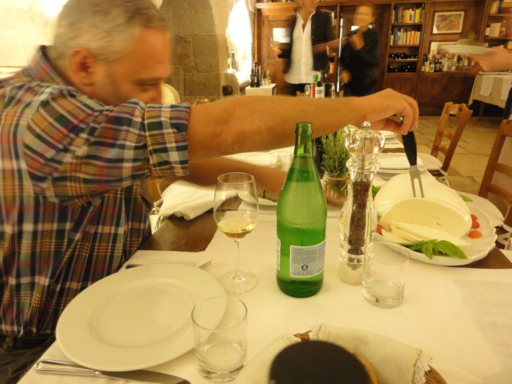 Aperitivo-antipasto al tagliere con prosciutto di cinghiale, un caprino da urlo stagionanto nelle vinacce di Negro Amaro, un caciocavallo buonissimo anche se poco stagionato, soppressata di cinghiale, finocchiona di cinghiale, e ducis in fundo la “zizzona di podolica dell’altopiano del Laceno”. E, vi assicuro, non è la vicinanza culturale a Nicola Campanile che mi fa “Campanilista”, ma mi domando e si domandavano tutti, al tavolo, sic stantibus rebus, a che serve la mozzarella di bufala??? Immagino già la tua faccia, caro Albert, ma te ne dovrai fare una ragione, l’altopiano del laceno è più in alto della piana del Sele…;-)) Per la cronaca, in abbinamento alla zizzona, Irpinia chiama e Nicola Campanile risponde…con un Greco di Tufo Cantine dell’Angelo 2010, ecchevelodicoaffare?