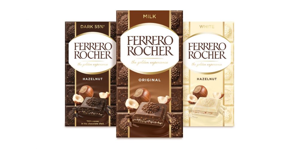 Ferrero Rocher adesso significa anche una tavoletta, di cioccolato al latte, cioccolato fondente o cioccolato bianco. Ognuna però mantiene la sua identità originaria, fatta di nocciole, in formato granella a fare da cupola ripiena.