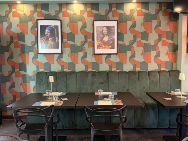 L’ambiente conta circa 50 coperti, caratterizzato da divani verdi e pareti con stampe artistiche ispirate a celebri opere reinterpretate in chiave “pizza”. Un’unica grande sala, con un secondo vano che affaccia su un giardino-orto, dove si trovano attualmente la camera di fermentazione e il magazzino, che in futuro sarà trasformata in una saletta aggiuntiva.
