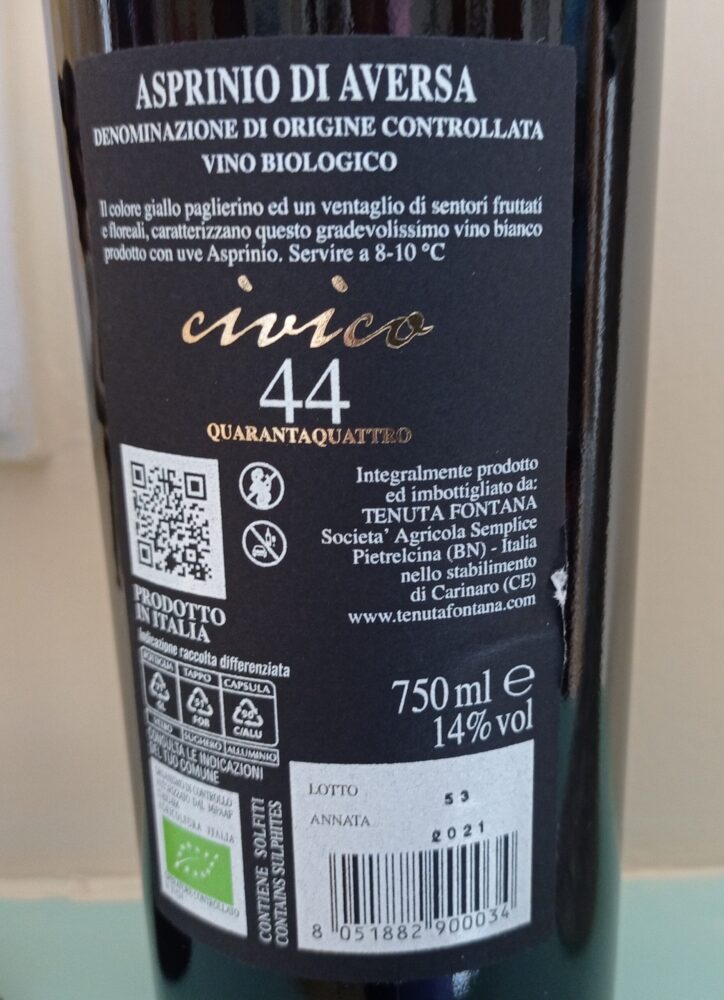 Una delle bottiglie più prestigiose è quella di Civico 44 Asprinio di Aversa Doc di cui ho appena assaggiato l’ultimo millesimo in commercio, il 2021.