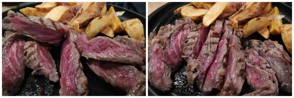 Per secondo continuiamo con la Marchigiana Igp e prendiamo una tagliata di controfiletto con una frollatura di circa 40 giorni accompagnata dalle Patate con buccia della casa con bacon e, manco a dirlo, con la Cipolla di Alife. La cottura della carne è rigorosamente al sangue per sondarne al meglio la tenerezza ed il sapore.