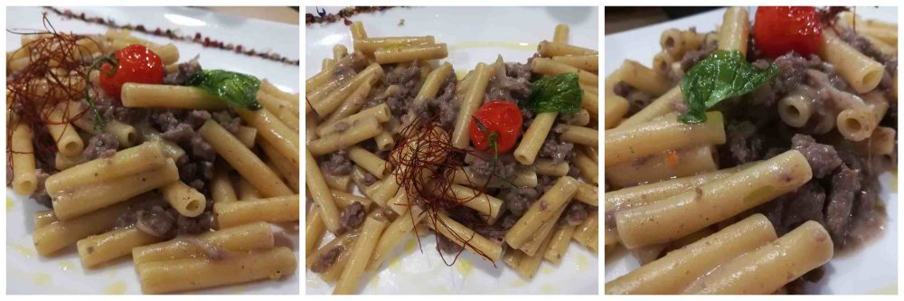 Altro prodotto del territorio Casertano che qui viene utilizzato è la pregiata Carne di Marchigiana Igp della Fattoria Della Rocca di Caiazzo, e con essa ci fanno anche gli “Ziti alla Genovese con la Cipolla Alifana”. E che fai? Puoi mai commettere il sacrilegio di non assaggiarli? E quindi Ziti siano! Un primo piatto assai gustoso, ricco di tenerissimi pezzetti di carne tagliati minuziosamente a cubetti ed esaltato da quella Cipolla che, date le sue peculiari caratteristiche, può essere mangiata anche da coloro che soffrono di una qualche intolleranza alle cipolle troppo forti. Una Genovese Alifana dunque, da non perdere assolutamente!
