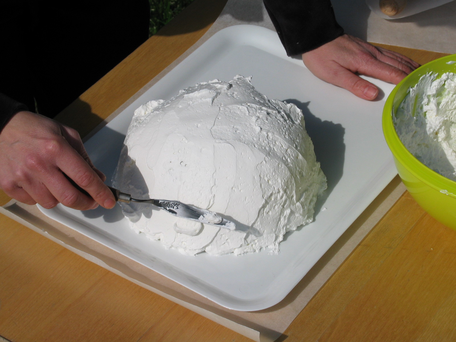 Fodera una ciotola con della pellicola per alimenti. Taglia il pan di spagna a spicchi e sistemali nella ciotola, uno vicino l’altro senza lasciare spazi vuoti. Bagna il pan di spagna con la bagna che preferisci. Io uso il latte perché conferisce al dolce un sapore delicato. Farcisci con panna o crema. Ricopri con altro pan di spagna, bagna e fai un altro strato di crema. Infine rivesti di pan di spagna, bagna e metti in frigo per almeno 2 ore.