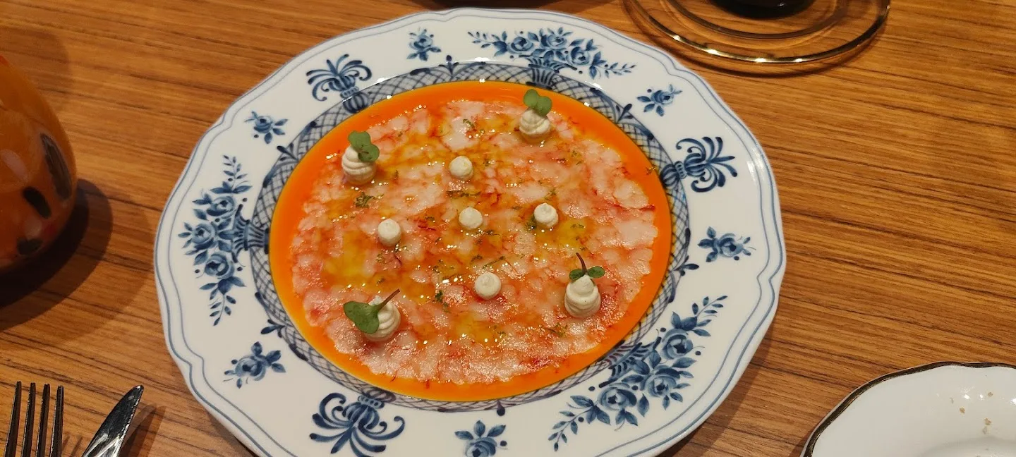 Clodia Club Restaurant, carpaccio di gambero rosso, lime, olio alla nduja