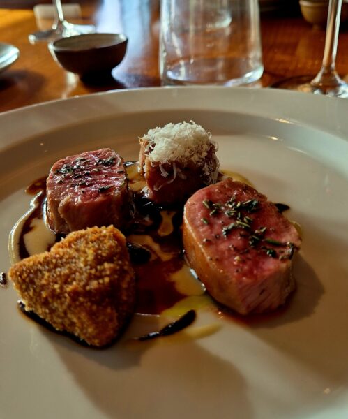 A seguire filetto di maiale laccato al miele di acacia, pancetta croccante e patate alle erbe aromatiche e fondo di manzo. Gustoso. Sarebbe stato delizioso se fosse stato un po’ meno asciutto.