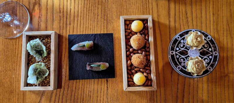Partiamo dall’entrèe: Cannoncino di pasta fillo ripieno di mousse di ricotta di bufala aromatizzata al limone; tartellette con pâté di olive e guanciale e peperoni in agrodolce e pecorino.