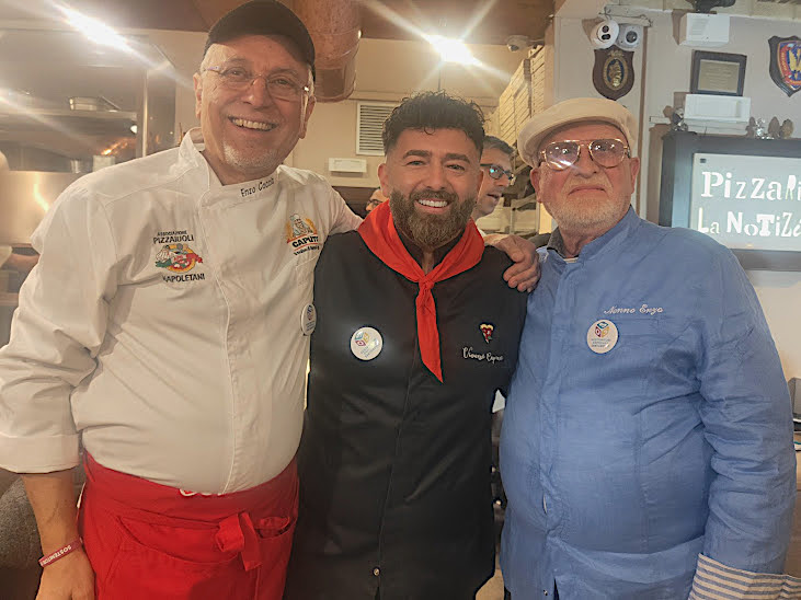 Tra collaborazione e sinergia, con tante pizze ammaccate, condite e infornate grazie al lavoro di squadra delle tre generazioni di pizzaioli e dei loro collaboratori sono state servite pizza Marinara, Margherita, Assaggio di piennolo ‘a rot e carrett e per finire Saltimbocca con cioccolato fondente o crema di nocciole, in abbinamento alla birra Menabrea.