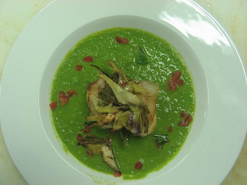 Tagliare finemente i carciofi, passarli qualche minuto in acqua e limone, asciugarli ben bene e soffriggerli in una padella con dell’olio extravergine d’oliva fino a diventare croccanti . Far soffriggere brevemente la coda di rospo in padella con poco olio, affettarla a tocchi grossi e longitudinalmente . In un fondina versare un po’ di crema di piselli, adagiare al centro due tocchi di coda di rospo e sopra di essa i carciofi croccanti.