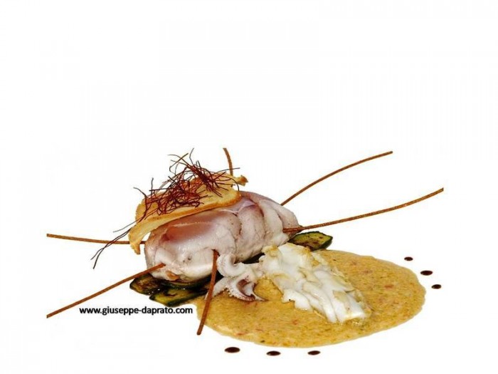 Cofanetto misto di pesce al vapore su crema allo zafferano e zucchini grigliati