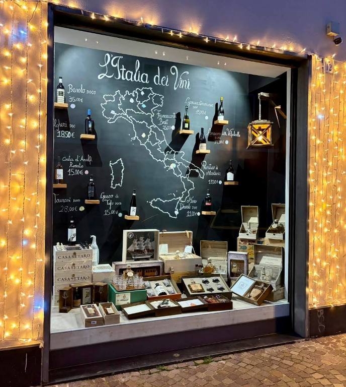 Simpatica e comunicativa l’idea di utilizzare per la vetrina una grande parete lavagna su cui sono indicati alcuni vini con relative denominazioni.