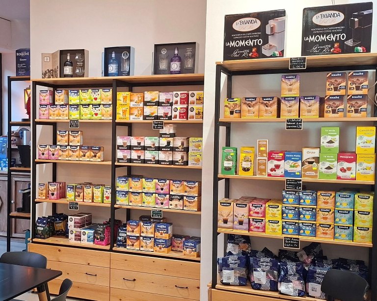 Ovviamente un posto importante è occupato dal caffè che rappresenta la genesi del locale in quanto nato nel 2016 proprio come rivendita di questa bevanda in tutti i formati e ubicato all’epoca in un’altra sede rispetto a quella attuale. Ben esposti sugli scaffali caffè in cialde, capsule, macinato o in grani oltre a una edizione speciale in cialde a marchio Caffè Faino.