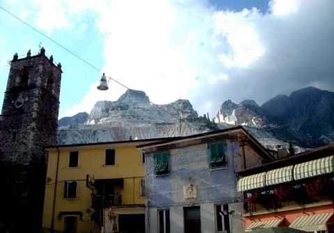 Colonnata ti sbuca dopo due tornanti secchi, appena passata qualche baracca di souvenir: aspro e stretto, quasi tutto a sasso, il paese si incunea tra montagne sbocconcellate e incappucciate da nuvole nere. Le asprezze della vita dei cavatori rimbalzano nella durezza di una parlata zeppa di zeta, e, per contrappasso, in modi e sorrisi schietti e gentili, ma soprattutto nella quadrata morbidezza del lardo di conca, umile companatico, tra un pomodoro e un fiasco di vino, necessario per sopportare la fatica sconciante della cava e della lizza.
