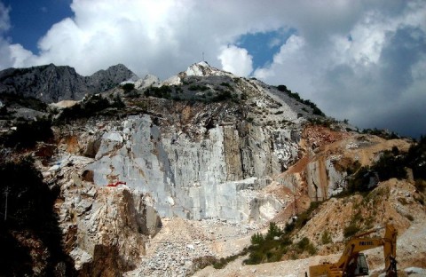 Lo scooter arranca sbuffando, il sole trapassa gli occhi, in un candore abbacinante. Salire verso Colonnata è come scendere all’inferno: tra lastroni di marmo, ravaneti e pietraie scoscese, blocchi abbandonati in un intrico di cavi, caterpillar e carrucole arrugginite, la polvere bianca si insinua, avvolge, difende le montagne affettate come torte alla panna, assemblate in un gigantesco Lego di pietra.