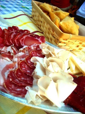 Il sole picchia, riflesso dal gigantesco biancore tutto intorno; le stradine, anzi la stradina che attraversa il paese è fresca e brevissima: un divertito parlare tra il genovese e lo spagnolo ci conduce sotto un albero di cachi, a sedere tra tavolacci, panche e tovaglie a quadri , davanti una bislunga di affettati e gnocchi fritti (che poi son sgabèi, ma, chissà perchè, son quadrati invece che lunghi un palmo).