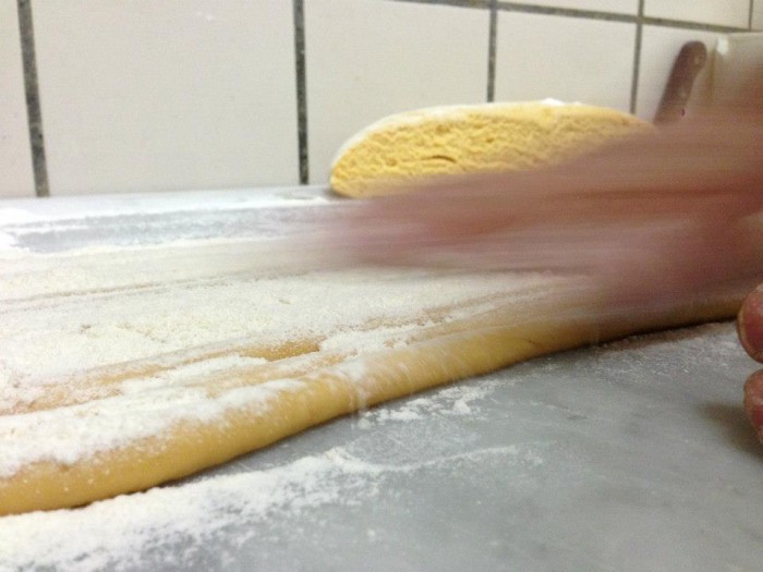 Spezzare l’impasto e allungarlo per poi tagliare a mo’ di piccoli gnocchi spolverando con abbondante farina.