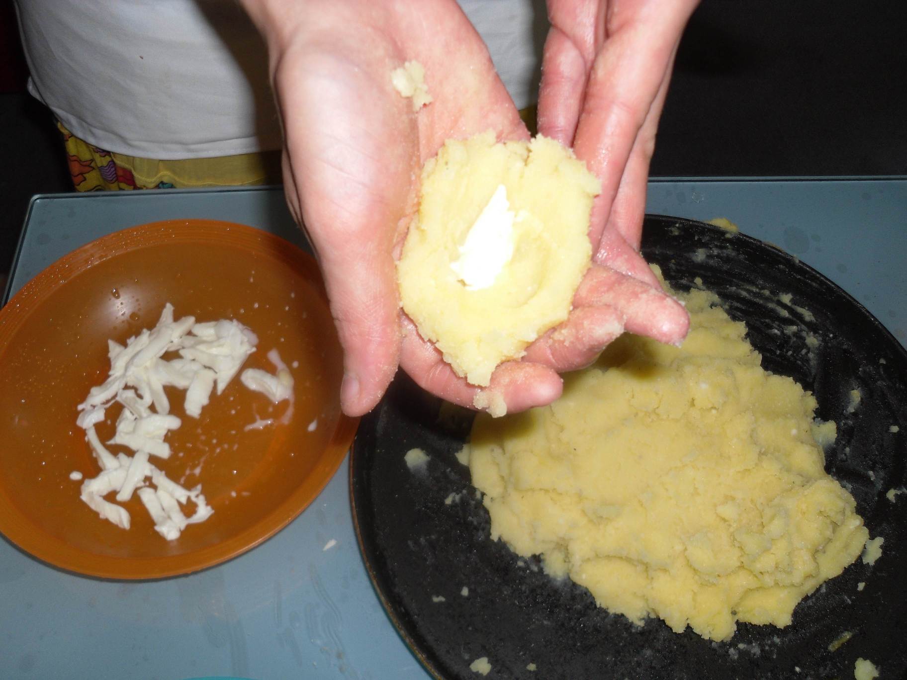 Crea delle piccole palline, al centro delle quali inserisci una striscia di mozzarella. Chiudi e forma il panzarotto.