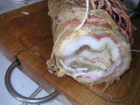 Nella lista degli ingredienti troviamo il lardo. Nella foto ( a mio avviso ) una pancetta arrotolata etichettata come guanciale nero casertano.