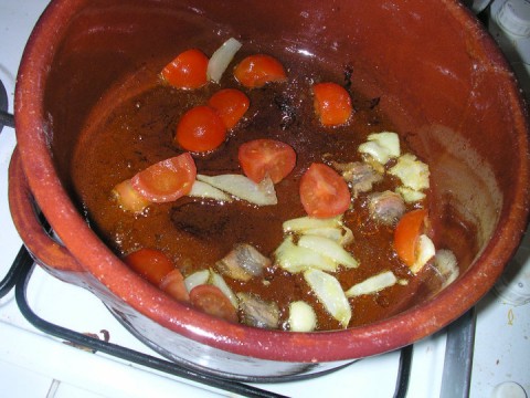 Quando si saranno dorate, cambiate il sistema di cottura aggiungendo un paio di bicchieri d'acqua calda. A parte frullate i pomodori, i pezzetti di aglio, di cipolla e di guanciale insieme a qualche pezzetto di patata in modo da ottenere una crema da rimettere in tegame.