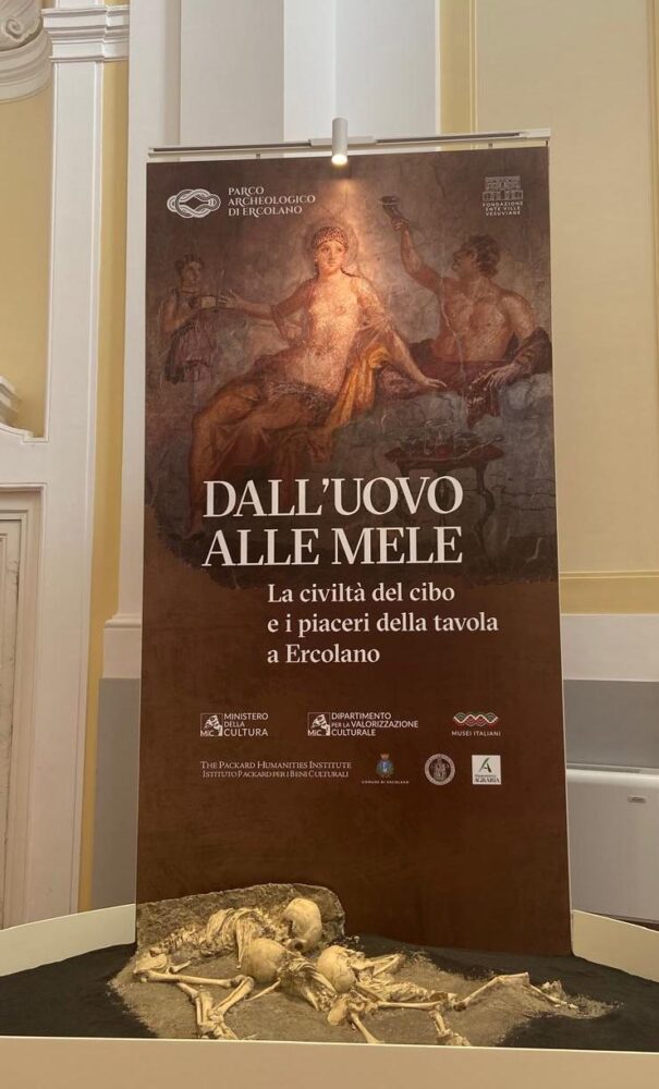 ‘Ab Ovo usque ad Mala’. Lo ha raccontato il poeta Orazio che un pasto completo nell’antica Roma iniziava con le uova e terminava con i frutti e adesso, quel mondo a tavola raffrontato al nostro condividere il cibo, ce lo racconta, fino al 31 dicembre, la mostra “Dall’uovo alle mele. La civiltà del cibo e i piaceri della tavola” allestimento del Parco Archeologico di Ercolano, organizzato con il Ministero della Cultura e la Fondazione Ente Ville Vesuviane e ospitata nelle sale affrescate di Villa Campolieto, una delle più affascinanti ville di età borbonica del Miglio d’Oro.