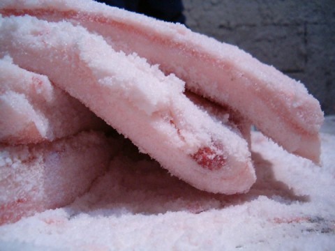 La prima salatura – La carne viene leggermente salata (prima salatura) messa a strati in una “mattera” di legno, adagiata su di un piano leggermente inclinato in modo da far scolare eventuali residui sanguigni.