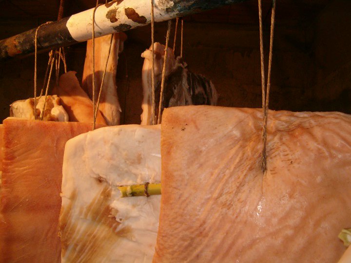 Trascorsi sette giorni di salatura, i pezzi vengono prelevati dalla “mattera” e lavati accuratamente con del vino, indi appesi per altri due-tre giorni alla pertica per farli asciugare dal liquido di lavaggio.