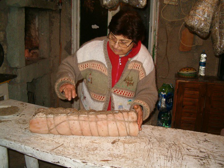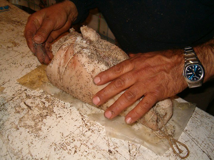 Una volta assicuratosi che i pezzi si siano asciugati perbene, Giovanni ne prende uno alla volta dalla pertica, li mette sul tavolaccio e inizia a massaggiarli con del pepe nero. Il pepe serve, oltre che a dare aroma alla carne, anche a preservarla meglio dall’insorgenza di muffe. Si comincia con i prosciutti. Appena terminato il massaggio con il pepe, i pezzi si incartano con la cosiddetta “pelle”, un sottilissimo budello artificiale che somiglia ad un cellophane, legati con filo di cotone e appesi nuovamente ai ganci della pertica. Il prosciutto è senza osso, né cotenna. È uno dei pezzi forti di Giovanni. La legatura è un operazione che si fa a 4 mani, in questa operazione Giovanni è aiutato dalla moglie Antonietta. Si prosegue con i guanciali (‘e vucculenie), che avendo la cotenna esterna, vengono prima arrotolati, legati per tenerli in forma, incartati e poi nuovamente legati. Man, mano che i pezzi si rimettono alla pertica, si punzecchia il budello con “’u pugne-pugne”, per permettere loro di respirare e stagionare meglio. Stessa operazione viene fatta per le “ventresche”, anch’esse con cotenna esterna: prima arrotolate strette con spago in luogo del filo servendosi de “’a zaffaraga”, un ago lungo e ricurvo, che un tempo serviva per fare le impunture dei materassi in lana.