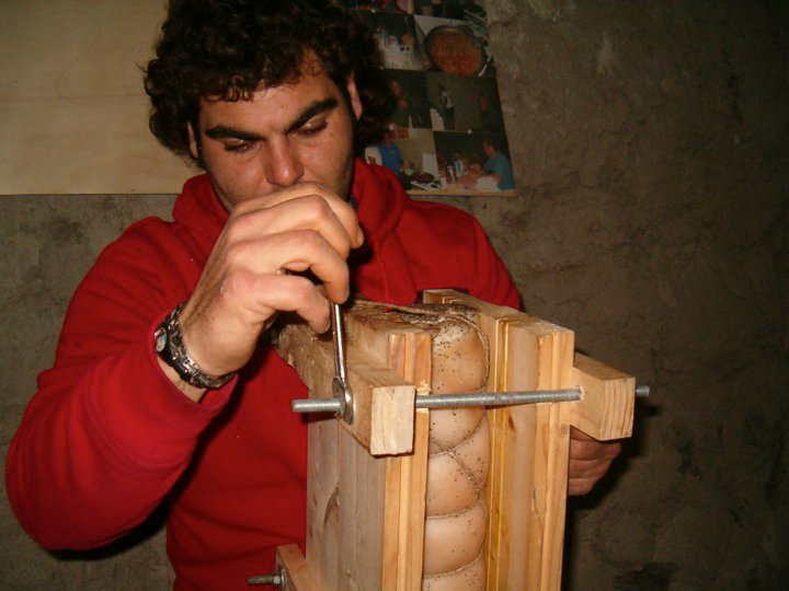 La “ventresca” pressata tra le tavole è un vanto di Raffaele che, all’uopo, ha costruito una sorta di gogna in legno dove stringere le ventresche per appiattirle e renderle più “magre”. Le tavole sono accoppiate a mezzo di lunghi perni passanti che recano dadi agli estremi. Serrando i dadi si raggiunge lo spessore desiderato. Raffaele con un metro da muratore verifica se la misura è quella desiderata in ogni punto del prelibatissimo salume. Man mano che la “ventresca” si asciuga, perdendo grasso e rendendo più evidenti le venature di magro, si provvede ad un serraggio graduale dei perni, fino al raggiungimento dello spessore finale che coincide anche con l’avvenuta maturazione del prodotto. Il tempo di stagionatura non è mai inferiore ai 2 mesi e cade, guarda caso, nel periodo (fine aprile-inizio maggio) in cui si consuma il più classico dei matrimoni: fave con la ventresca.