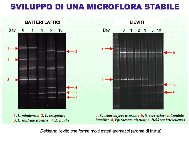 Il lievito pur mantenuto in condizioni costanti e pur usando la stessa farina, continua a cambiare perché nella farina sono presenti microrganismi diversi che possono prendere il sopravvento rispetto ai precedenti, come dimostrato dai due diagrammi allegati.
