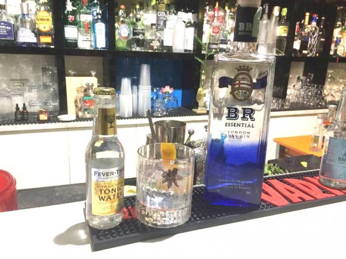 Mario parte sicuro, nemmeno un indugio e mette sul banco BR gin 14 botanicals, 5 distillazioni, sentori di pepe giamaicano, timo e ginepro, alcuni botanicals sono distillati singolarmente e aggiunti dopo. Spiccano anche sentori di agrume candito e anice. Mario allunga sicuro e tranquillo di fever tree, aggiunge twist di buccia d’arancio e bacca di anice stellato. Tutto scorre su un buon equilibrio, ma un’intera stella di anice è decisamente troppa, stucchevole, si consiglia un passaggio veloce e via.