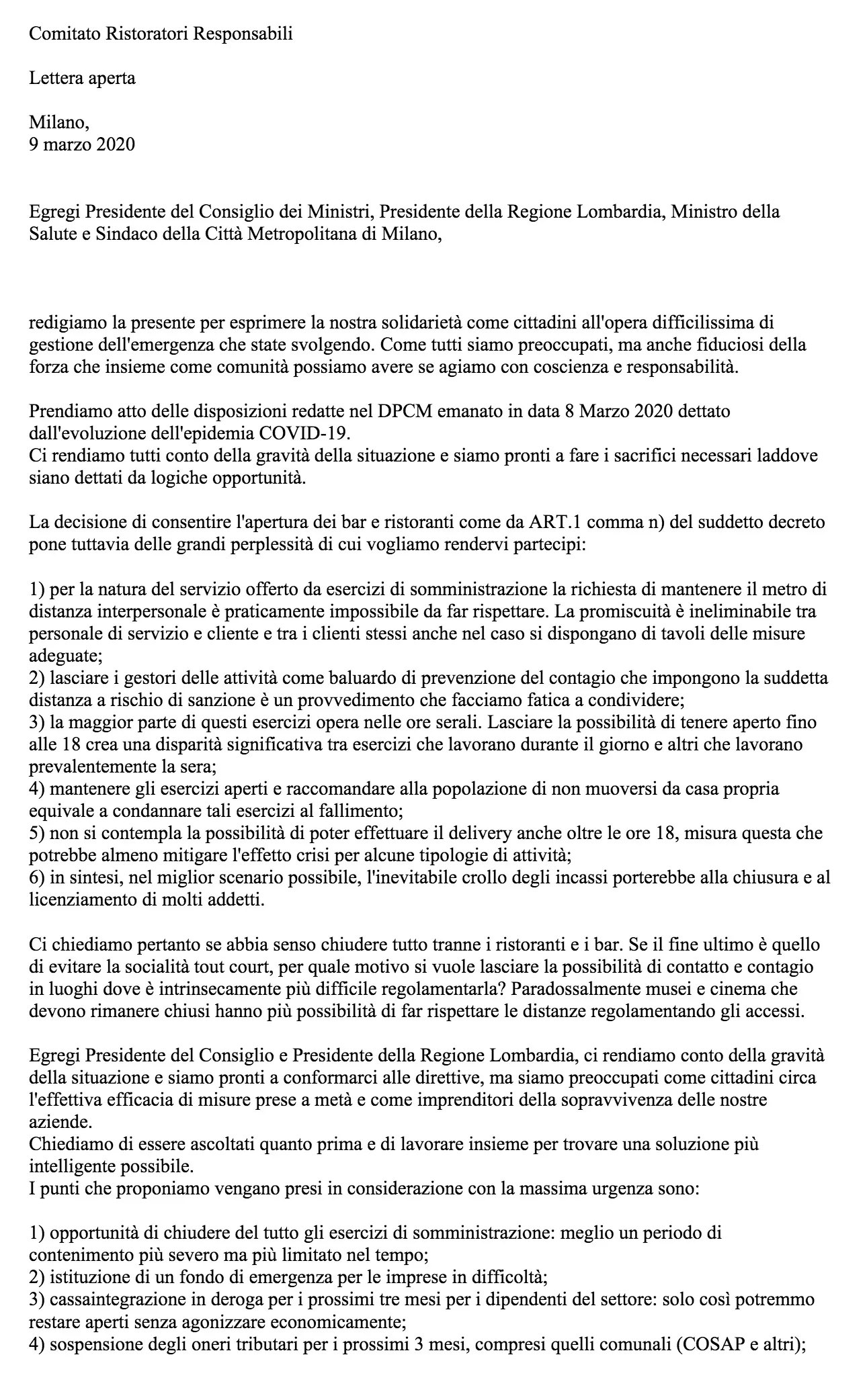 Ristoratori di Milano 10/3/2020 Torna a: Coronavirus| Comitato Ristoratori Responsabili: centinaia di firme a Milano con le richieste al governo, alla Regione e al Comune. Impossibile restare aperti Successiva →