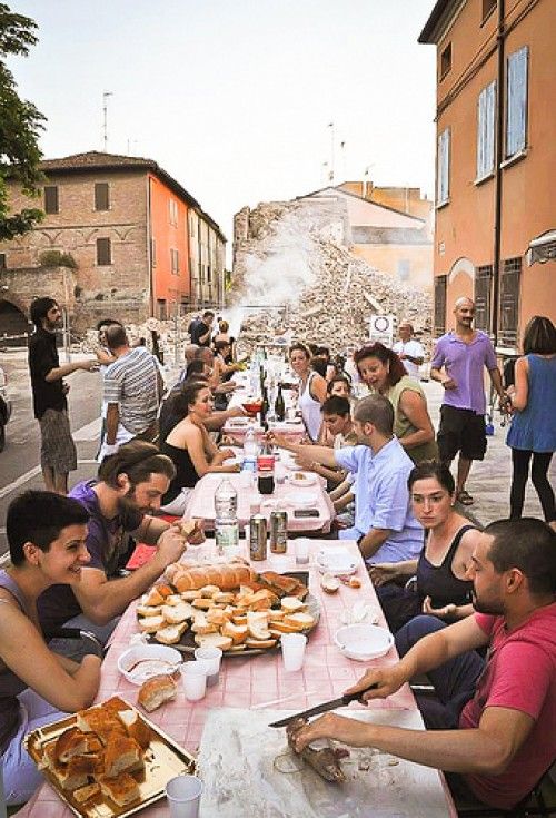 Non ci credete? Fate male: guardate questa foto scattata a Finale Emilia, dove i cittadini della zona più colpita hanno deciso di organizzare questa cena trenta giorni dopo il terremoto del 20 maggio che ha quasi distrutto la cittadina della bassa modenese.Niente lacrime e niente rimpianti ma solo sorrisi. Poi, pane e salame e un bicchiere di Lambrusco.