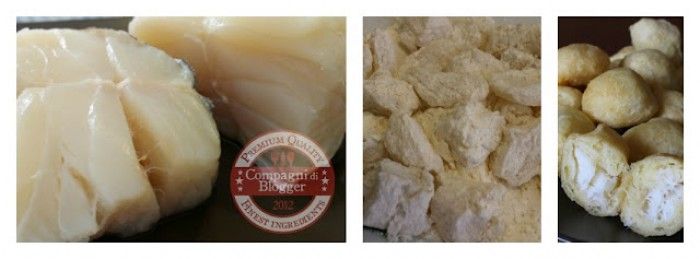 Nel frattempo si preparano i filetti disossati di baccalà, tagliati in pezzi grandi circa tre dita. Vanno infarinati e fatti rosolare per pochi minuti in una padella con un po’ di olio, preparando cosí ‘l’anima’ delle frittelle.