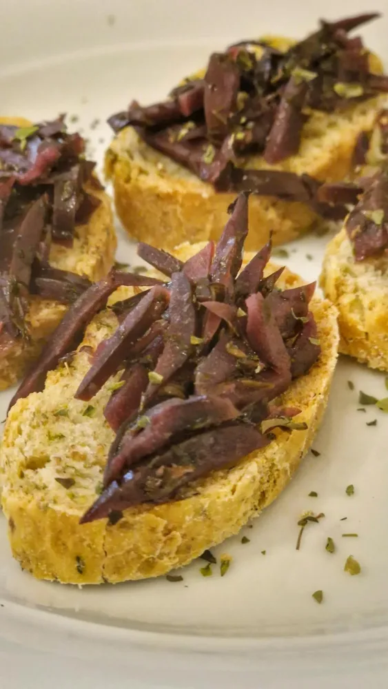 Vista l’esplosione al gusto del Conciato Romano, ben equilibrato dalla mela, si consiglia di assaggiare prima il pane con le bucce di melanzane in agrodolce.
