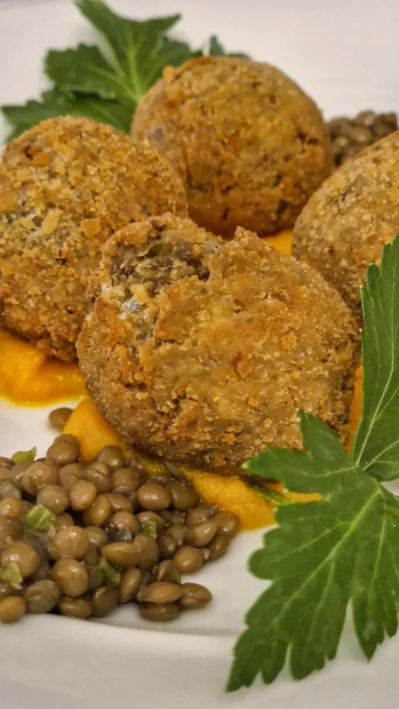 A seguire: tartelletta di nocciole con biete, spinacino, borragine, quadrello e caciotta di bufala e polpette di lenticchie di Castelluccio