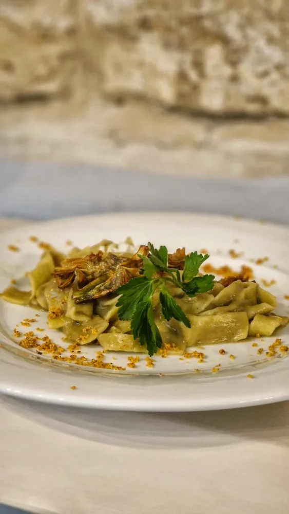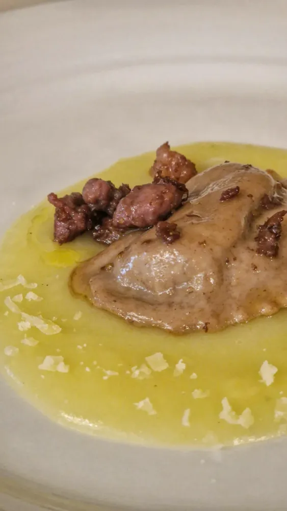 Avrei potuto terminare la mia pausa già così, ma le tagliatelle fresche con crema di cuore di carciofi e croccante di mandorle, meritavano l’assaggio così come il raviolo di farina di castagne con soffice di patate e briciole di salsiccia di maiale nero casertano.