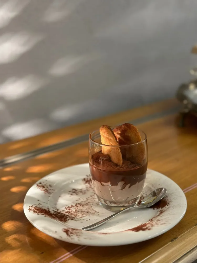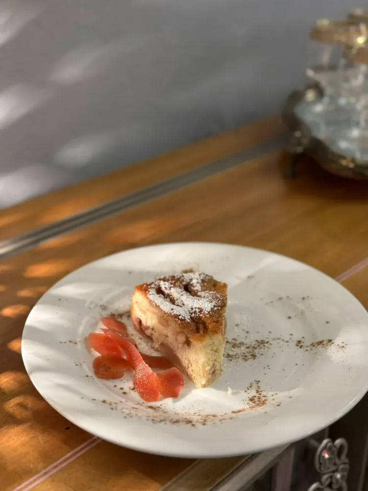 Per concludere, cremoso al caffè con biscotti e torta di mele annurche accompagnata da crema pasticcera e bucce di mela caramellate.