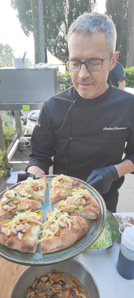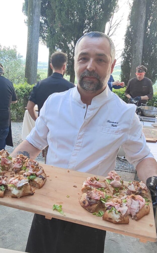 Montanara classica pomodoro ricotta salata e pesto di basilico e un’altra con pomodoro, stracciata di fiordilatte e prosciutto crudo di Parma sono state le proposte di Giovanni Santarpia, originario di Castellammare di Stabia, pluripremiato ormai stabile in Toscana dove ha avviato un lavoro di valorizzazione e promozione della pizza napoletana, che ha fritto e condito le sue pizze in uno scenario incantevole con vista sui filari dell’area di San Gimignano.