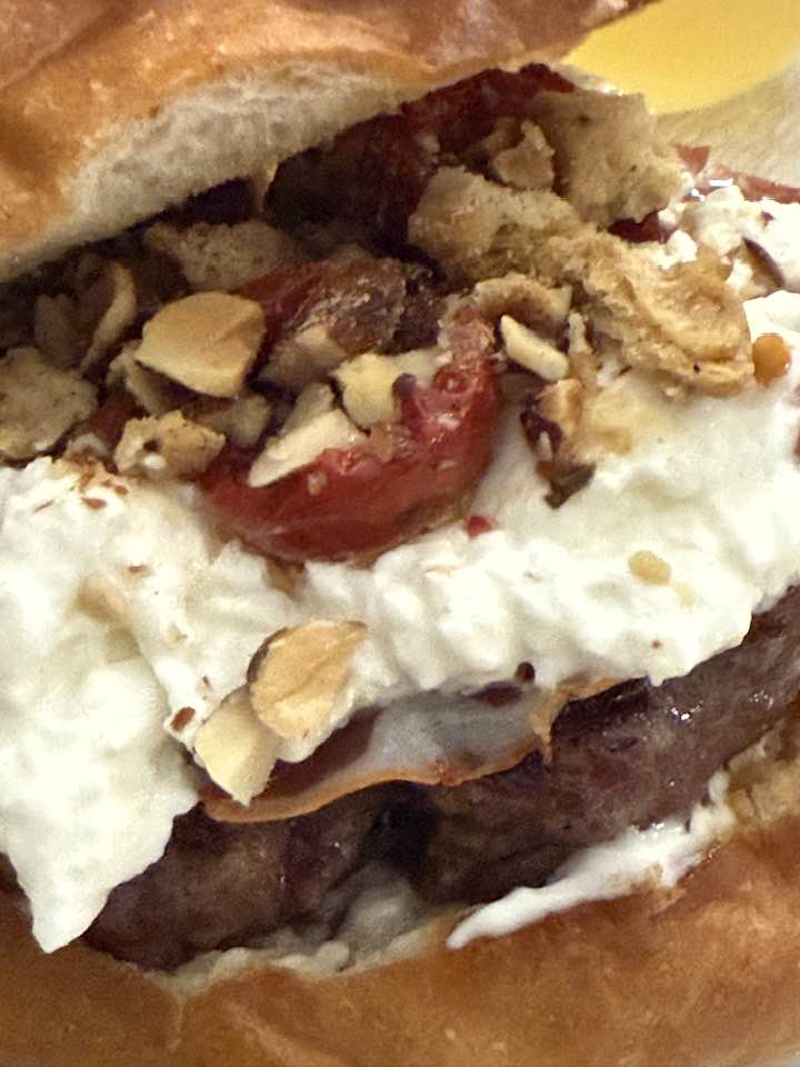 Il pastrami finisce presto e subito altri due panini, uno classico american burger con hamburger, cipolla, cheddar e bacon per il mio amico, mentre per me, Era Estate con capicollo di Martina Franca, stracciatella di bufala, tarallo, e maionese al lime, fatta da Ornella.