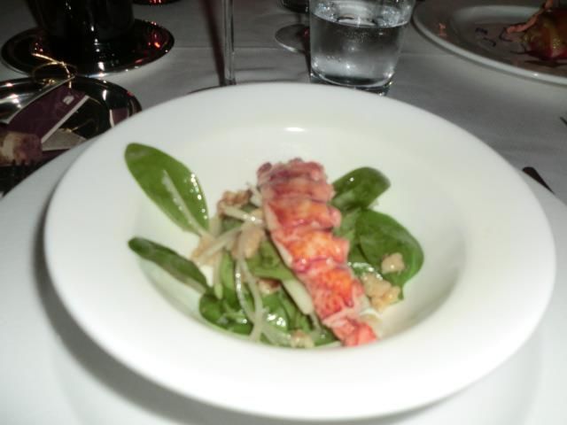 Variazione di crostaci: astice su passata di ceci con olio alcarbone. Insalatina di fave con lardo di Colonnata e gamberoni rossi. Raviolo di scampi con pomodorini e limone cadito