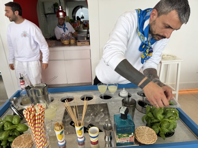 Quest’anno Concettina ai Tre Santi segna un’evoluzione nel racconto dell’isola, con un’attenzione crescente verso il tessuto produttivo e artigianale dell’isola. L’obiettivo è costruire relazioni autentiche con i capresi, valorizzare l’agricoltura locale e dare spazio ai piccoli produttori. È dalla carta dei vini che questa visione prende forma: un percorso costruito in sinergia con la Campania vitivinicola e in particolare con Capri, che mette in primo piano le eccellenze dell’isola. Tra le referenze, spiccano le etichette della cantina “Chalet Azzurro Mare” di Anacapri, fondata dal gallerista Franco Senese, che promuove una viticoltura eroica, biologica e basata sul recupero della biodiversità.