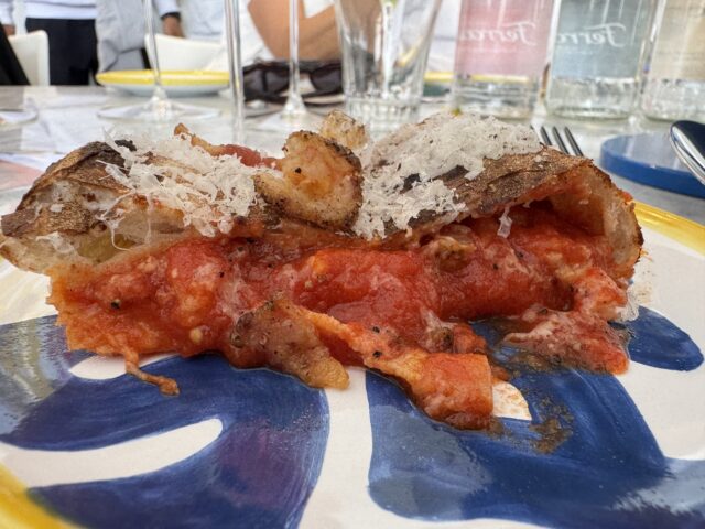 Anche la proposta gastronomica riflette questa identità rinnovata. Rispetto alla sede storica del Rione Sanità, molti piatti sono esclusivi della sede caprese, frutto dell’unione tra ingredienti dell’isola e materie prime della terraferma. L’ incontro con Umberto De Magistris, chef napoletano del Ristorante Wine Bar Pulluli Capri, ha portato alla collaborazione per la pizza con la genovese, creando un ponte tra l’isola e Napoli con il celebre ragù di cipolle e carne.