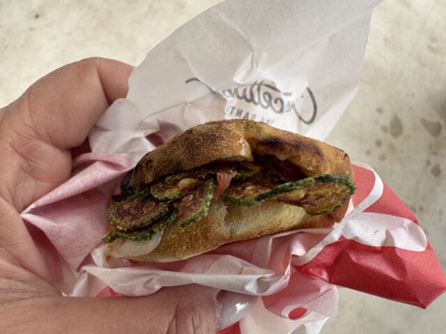 Panino Annarella: panino realizzato con impasto della pizza, farcito con zucchine in crema, in chips e fritte, prosciutto crudo, provola affumicata, olio extravergine d’oliva e un tocco di peperoncino.
