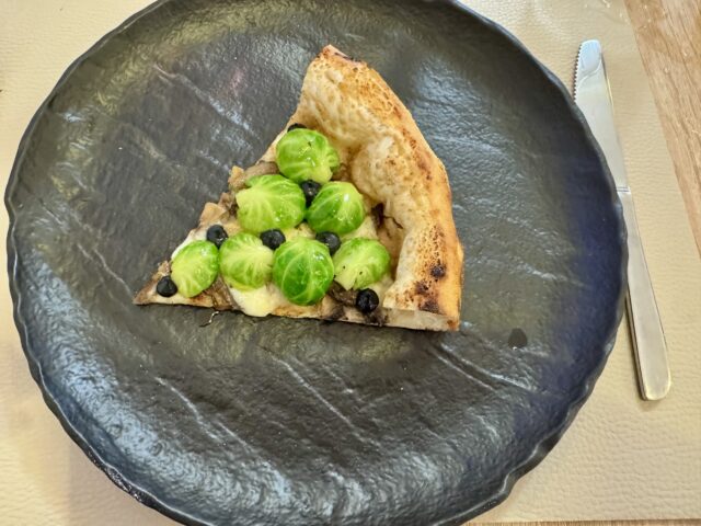 Il menù è costruito come un percorso gastronomico tra base di pizza napoletana contemporanea, in padellino, in pala e doppia cottura, dove non mancano i gusti dei grandi classici, un focus su ingredienti del territorio e un percorso di degustazione. I topping sono un asso nella manica di Concetto Partenopeo: giocano di equilibrio e innovazione e sopratutto evidenziano il lavoro sugli impasti e sulle cotture (dietro l’armonia dei condimenti c’è anche il contributo dello chef Giuseppe Olivieri). Tra le creazioni di Felice Mellone, quella che a mio avviso più rappresenta l’anima creativa in questo menù stagionale, è la tonda Visione Autunnale: fiordilatte, crema di castagne, misto di funghi freschi champignon, porcini, pioppini e pleurotus spadellati e in uscita, cavoletti di Bruxelles sfogliati e aglio nero.